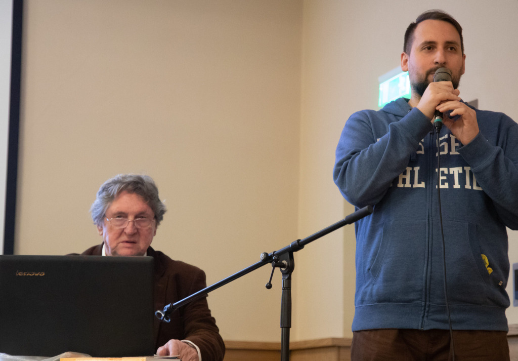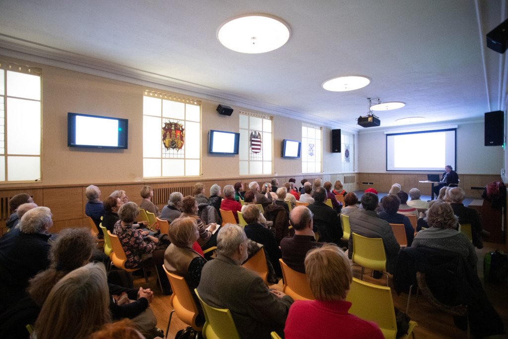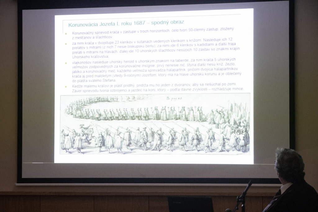A régmúltban tett lebilincselő utazásunkat egy igazi szakértő, dr. Vladimír Segeš vezette, aki történelmi látképek segítségével mutatta be a koronázások számos figyelemre méltó részletét. A képeket kisebb részekre, sorozatokra bontotta, amelyek tüzetes vizsgálatával jól láthattuk például azt, hogy milyen dulakodás alakult ki az esemény közönsége körében a nemzeti színű koronázási posztóért, és azt is, ahogy a 9 éves I. József koronázási köpenyét tartják, hogy ne a földön húzza. Köszönjük dr. Segešnek a tartalmas előadást, és várjuk a 2019-es esztendő további, hasonlóan magával ragadó eseményeit!