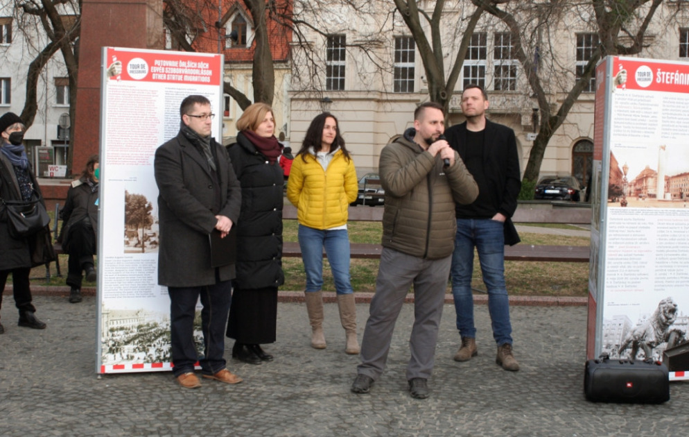 A „Tour de Pressburg – szoborvándorlás Pozsonyban” kiállítás megnyitóját 2022. március 16-án, szerdán tartották. A Korpás Árpád, a Pozsonyi Kifli Pt. alelnöke által moderált eseményen két beszéd is elhangzott. A kiállítás egyik kurátora, a Pozsonyi Kifli Pt. alelnöke, Ján Vyhnánek szlovákul szólt a Redut előtt összegyűlt néhány tucat emberhez, rámutatva egyebek között arra, hogy a tárgyalt alkotások a város ékei voltak, és bár csak rövid ideig maradhattak a helyükön, a város lakóit gyakran erős kötelék fűzte hozzájuk. Utána pedig nehezen élték meg a szobrok, emlékművek eltávolítását vagy elpusztítását. Talán a legjobb példa erre a rakparton felállított, ma már kultikusnak számító Mária Terézia-szoborcsoport, amelyet 1921-ben elpusztított a Csehszlovák Légió.