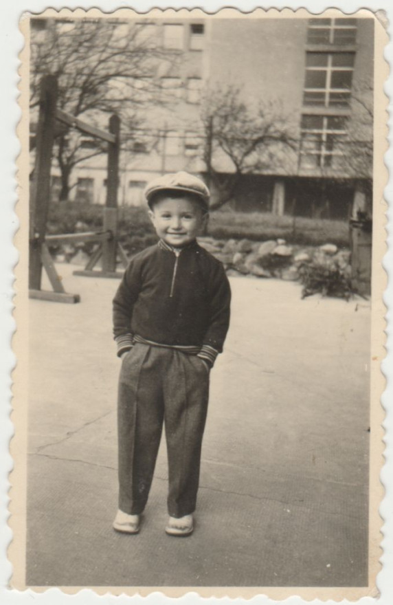 A szerző 4-5 évesen, a ház mögötti udvaron álló, fából ácsolt poroló mellett fényképezve. Háttérben a jelenlegi rendőr-főkapitányság épülete