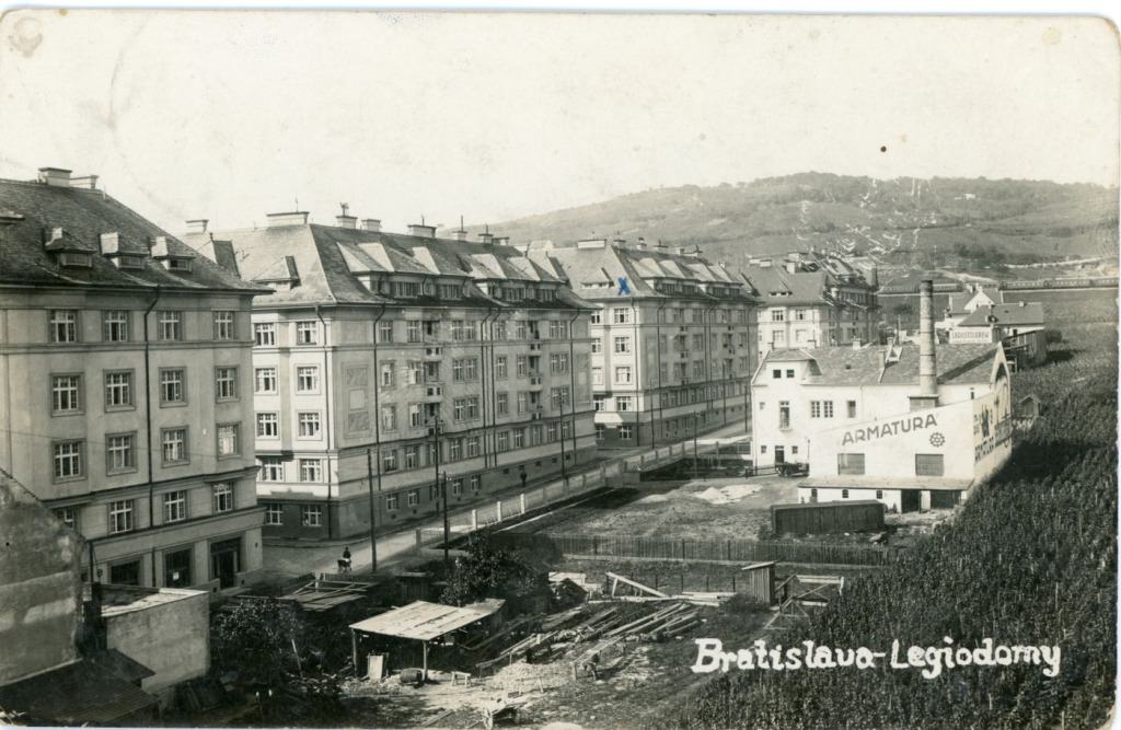A legionáriusházak és az Armatúrka üzem, ahol sokat játszottunk, amikor bontották. A felvétel a házunk közeléből készült. (OZ Bratislavské rožky, zbierka J. Horváth)