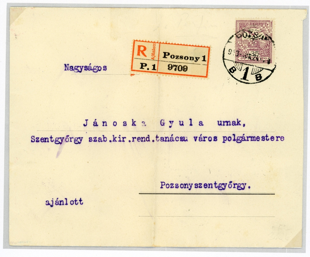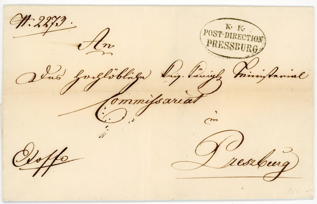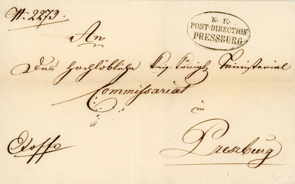 A pozsonyi postaigazgatóság bélyegzője. A levelet a nagytekintetű pozsonyi császári és királyi miniszteri biztosságnak címezték