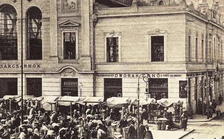 A pozsonyi Főposta épülete. Jobboldalt a Szlovák nemzeti felkelés terén (Námestie SNP) álló, még átépítetlen épület Orsolya utcai (Uršulínska) sarka, baloldalt a mai formája látható