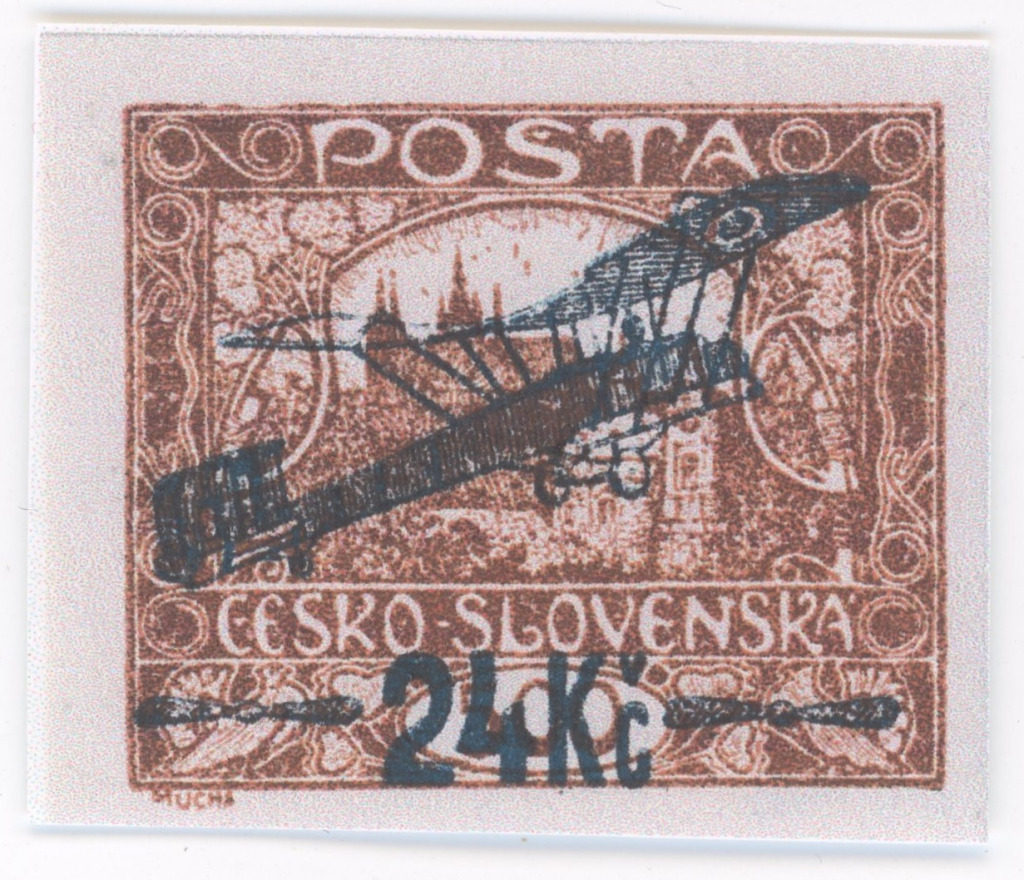 Az első légipostabélyegek úgynevezett ideiglenes bélyegek voltak. Ezeken két korábbi kiadás, a Hradzsin, illetve a Gazdaság és tudomány hat, illetve három névértékét használták felé újra, de a szegélyen nem voltak feltüntetve a névértékösszegek, és az egyes bélyegekre repülőgép- és értékjelző felülnyomatok kerültek.