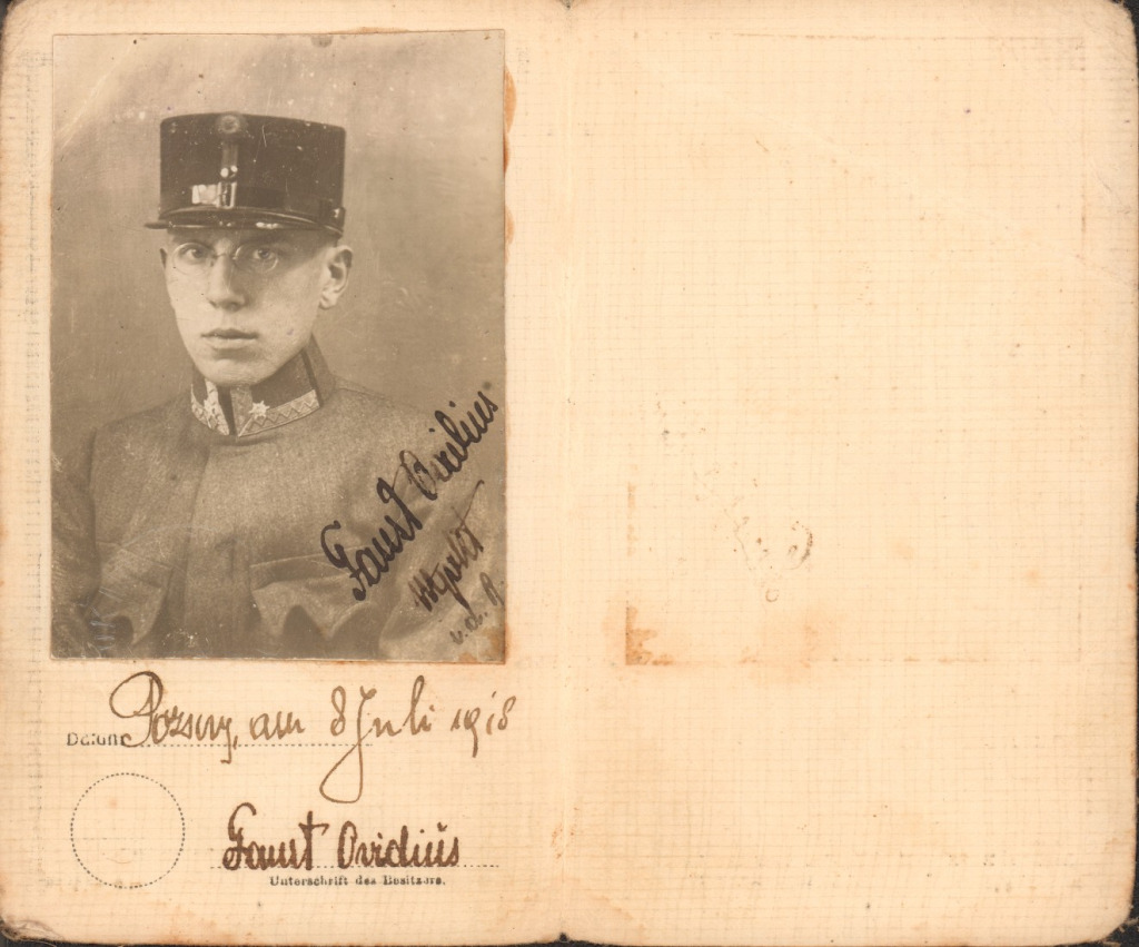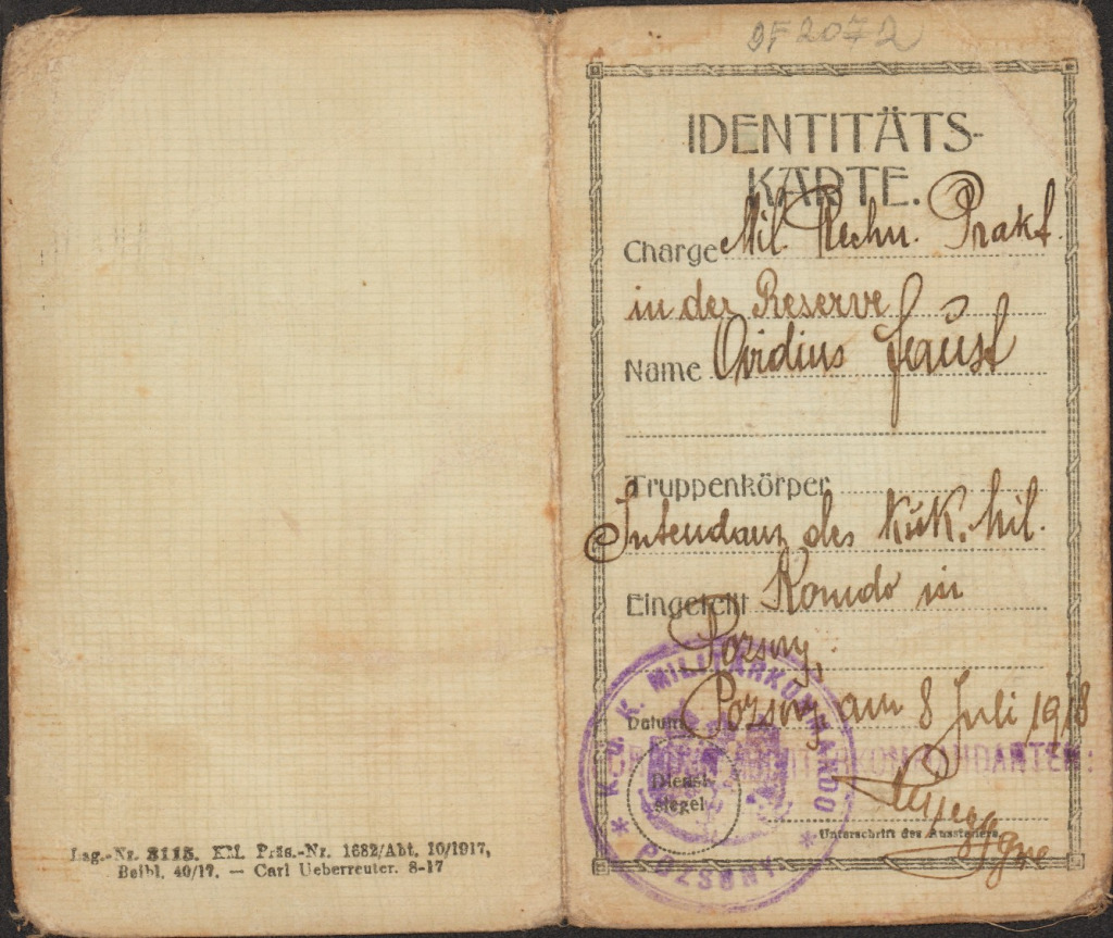 Faust Ovidius katonai intendatúrai igazolványa, 1918. Forrás: Faust Ovidius hagyatéka és a Pozsonyi Városi Múzeum fényképarchívuma