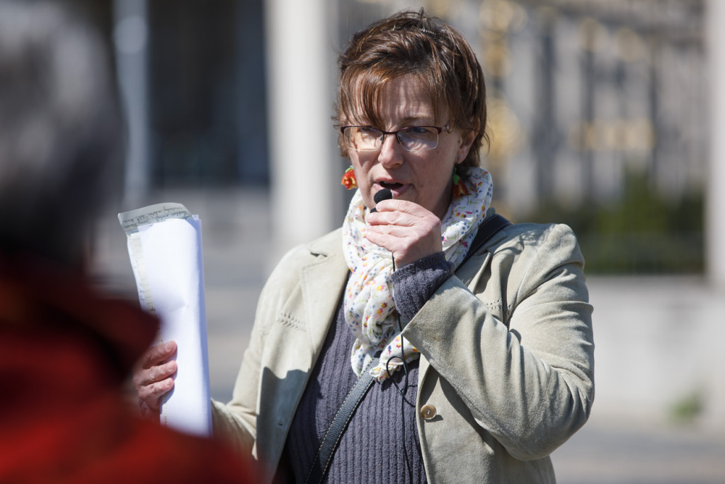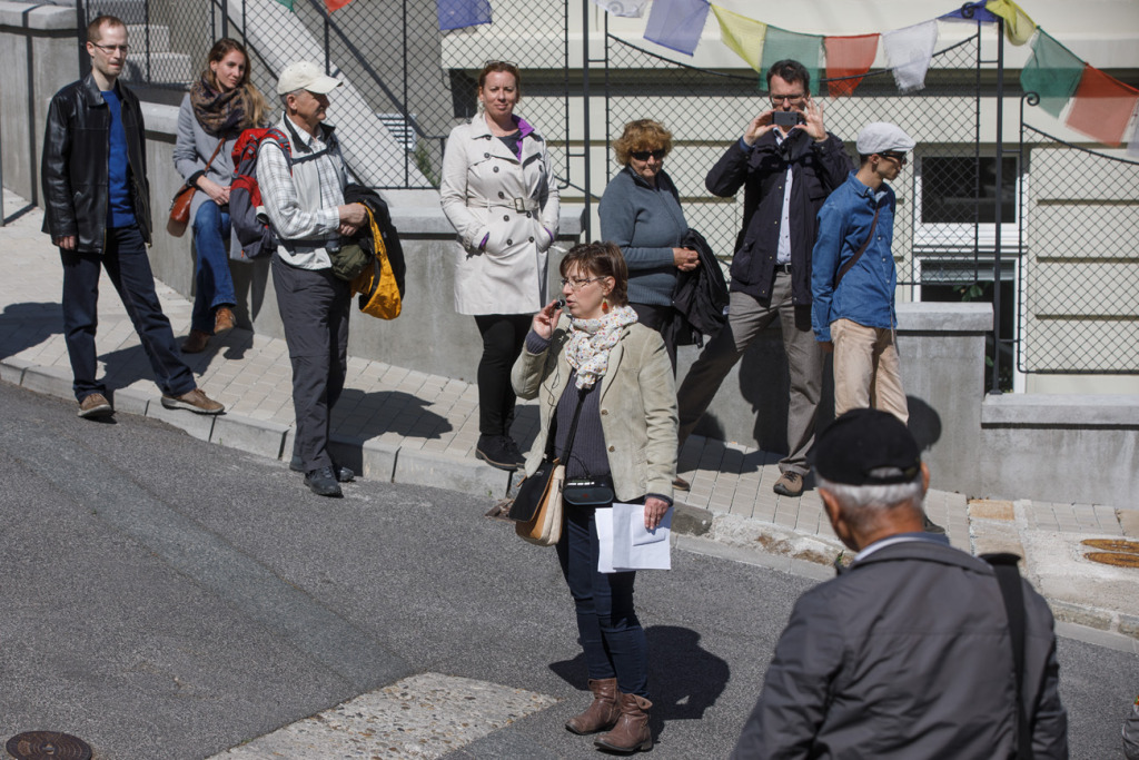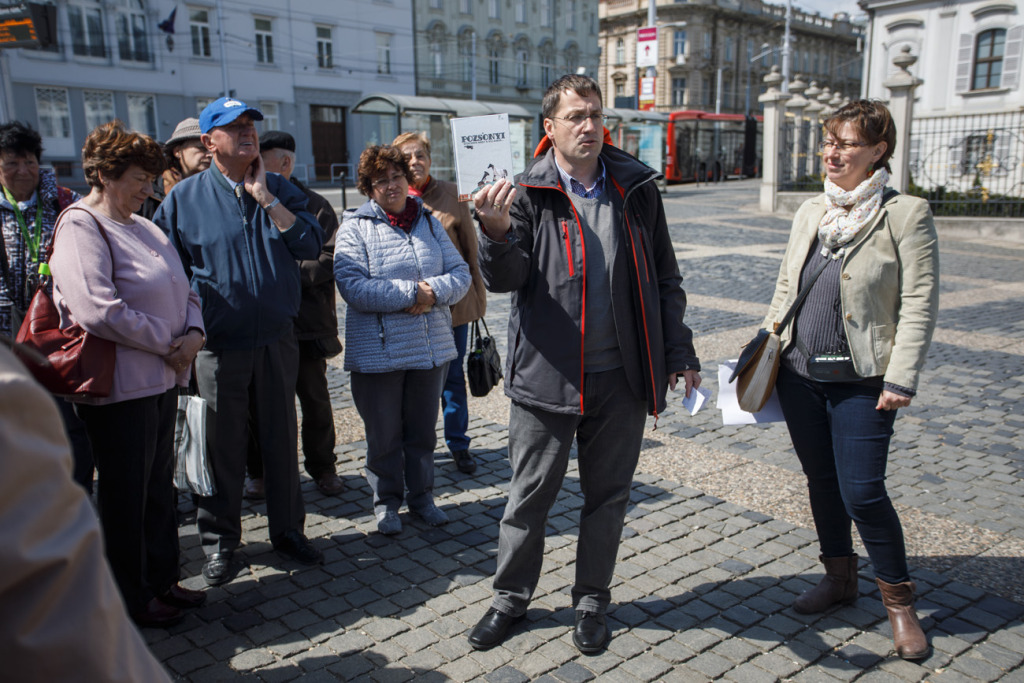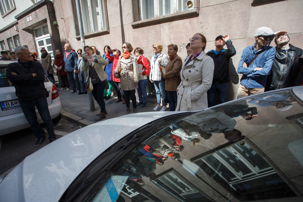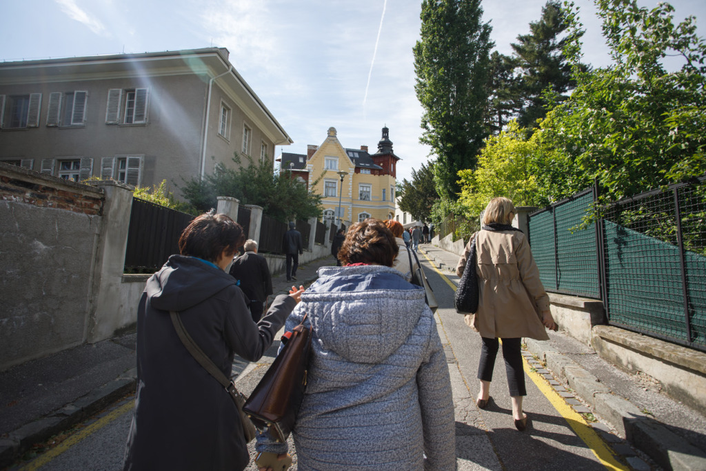 A város fölé magasodó egykori Újtelepre (Neustift) és környékére, vagyis a Védcölöp út (Pallisadenweg, ma Palisády) és a Stefánia út (Stephaniestrasse, ma Štefánikova ulica) által határolt, korábban világi vagy egyházi tulajdonú kertek, szőlőskertek és gyümölcsösök helyén épült villákhoz kapaszkodtak fel április 28-án az érdeklődők B. Mánya Ágnes vezetésével.