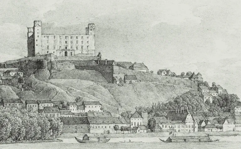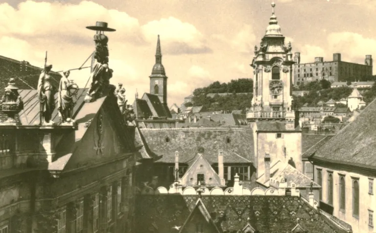 Baloldalt Heinrich Prüger első pozsonyi működési helye, a Hal téri városi sörfőzde – az üvegezett verandás épület.