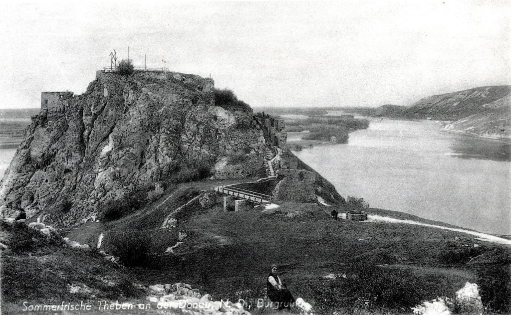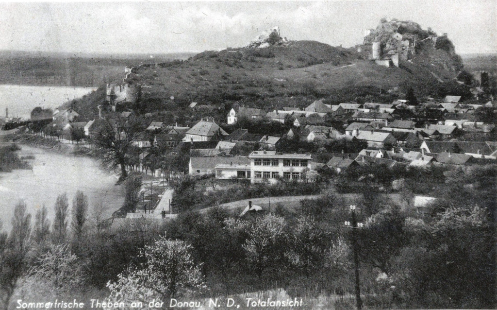 Dévény község látképe egy korabeli képeslapon. Dévény sziluettje végül a Német Birodalom ambiciózus tervei ellenére is megmaradt. Nem épült meg az erdőd a várdombon, és nem lett semmi a hatalmas dunai kikötőből sem, ami gyökeresen megváltoztatta volna a település képét. (Forrás: a szerző archívuma)