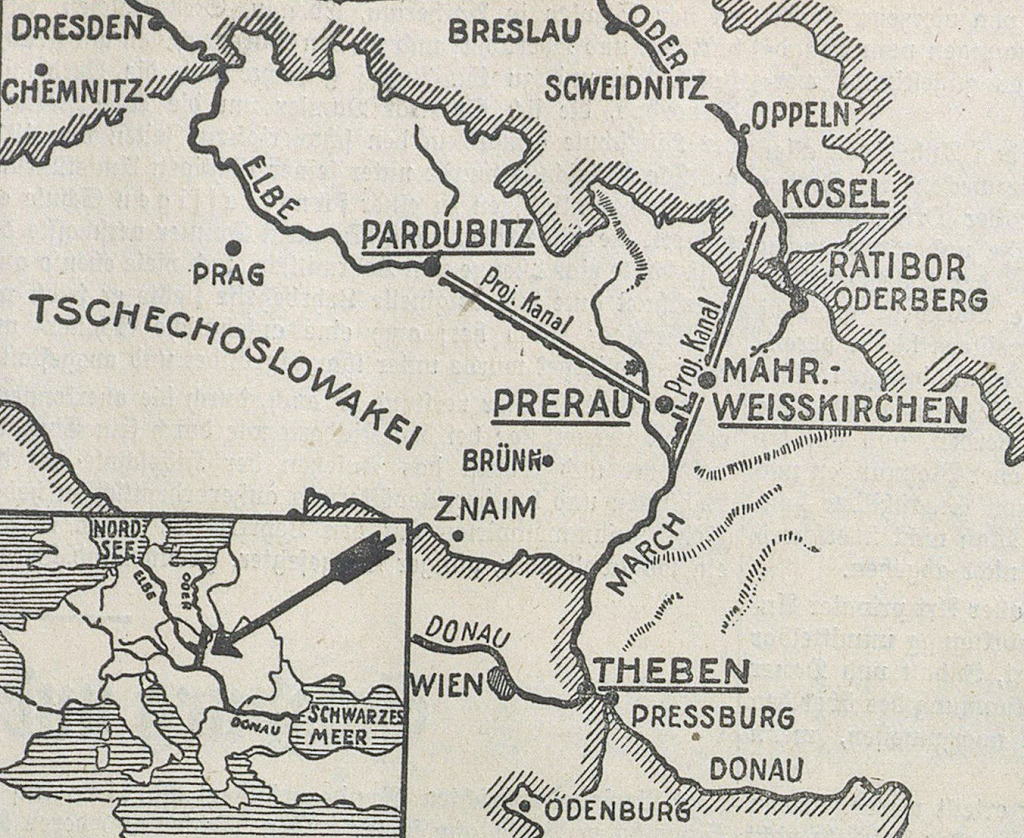 A tervezett, 325 km hosszú Duna–Odera-csatorna térképe egy korabeli lapból. A nagyszabású terv célja a Balti-tenger és a Fekete-tenger összekapcsolása volt az Oderán, a Morva folyón és a Dunán keresztül. Dévénynél nagy kikötőnek kellett épülnie, amihez 1939-ben meg is kezdték a tereprendezést. A hat évre tervezett építkezést végül a háború hiúsította meg. (Forrás: a szerző archívuma)