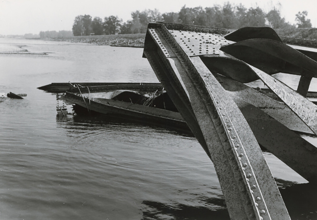 Viliam Malík: A visszavonuló német hadsereg által lerombolt Štefánik híd, 1945. Forrás: Fotográfiai Múzeum