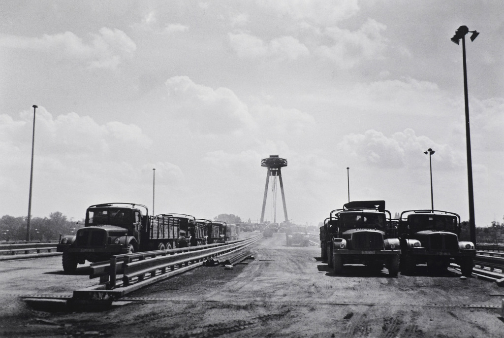 A tárlat anyagát a két híd képe foglalja keretbe: az egyiket lerombolva, a másikat az építés, a következő képen pedig a teherpróba fázisában láthatjuk. Ezekhez a fotókhoz kapcsolódik az 1969-es felvétel az építési területről a mai Óvárosi utca (Staromestská) helyén, ahol áll még néhány, a városfalhoz tapasztott ház. Ezek hamarosan az útépítés áldozatásul esnek, magára hagyva a falat, amelyet Mária Terézia idején a jelenlétükkel óvtak meg a lerombolástól. A leendő út másik oldalán őrzi helyét a Jó pásztor háza, felette már növekszik a Szlovák nemzeti felkelés hídjának pilonja. Láthatjuk a várdombon a romos és a csaknem teljesen felújított Pozsonyi várat, előtte a régi, ma már nem létező kis házakkal. A várlépcsőn egy anya viszi felfelé gyermekét a fények és árnyak lenyűgöző játékában.