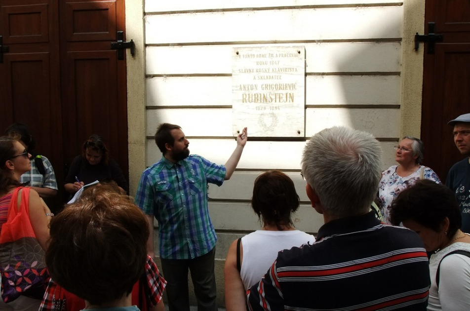 Egy forró szombat délután (2014. július 12-én) két lábon járó enciklopédiánk, Janko Vyhnánek visszavitt minket azokba az időkbe, amikor a leghíresebb szólózenészek még másodosztályon vonatoztak koncertjeikre, amikor az I. világháború idején olykor gyertyafényben kellett játszani, amikor az Óvárosháza udvarán még állt a számos híres zenész hangversenyének otthont adó, közkedvelt neogótikus Tanácsterem.