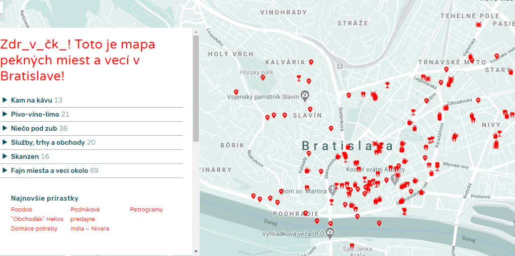 A látni- és megélnivalókat (amelyek sok esetben minden, csak nem látványos, szem előtt levő monumentumok) apró, számozott, piros pontok jelölik – a helyszínek első harmadát kávézók, cukrászdák, bisztrók teszik ki. Rögtön utánuk konzummentes felületek, a szabad sétálgatás, ücsörgés, őgyelgés, kanyargás (még) nem privatizált helyei kerülnek bemutatásra. Hol csak pár percnyi bóklászást igénylő minifelfedezésekről, hol pedig egész napos tippekről van szó: a megadott pontok egyaránt lehetnek terv nélküli, magányos lődőrgések, spontán felfedezőtúrák, páros séták és családi kiruccanások célpontjai is. Ebben a konstellációban, bizony, még a Rohlík névre keresztelt sekély és zavaros vizű ružinovi kacsaúsztató is külön szócikket érdemel, főleg, ha igaz, hogy vizében egy kis szerencsével teknőcöket is láthatunk, akik szép, meleg délelőttökön egyenesen a parton sütkéreznek (az internetes szócikkeket amúgy bárki kiegészítheti, megtoldhatja egy-egy tippel, kommentárral). Az 510-es szám alatt például néhány antikvárium lett egybegyűjtve, egy-két soros kedvcsinálónak az is megteszi, hogy a mennyezetig tornyosuló könyves stószok közt görnyedő tulajdonos egy „kitűnő bácsi”, akivel bármikor remekül el lehet dumálni.