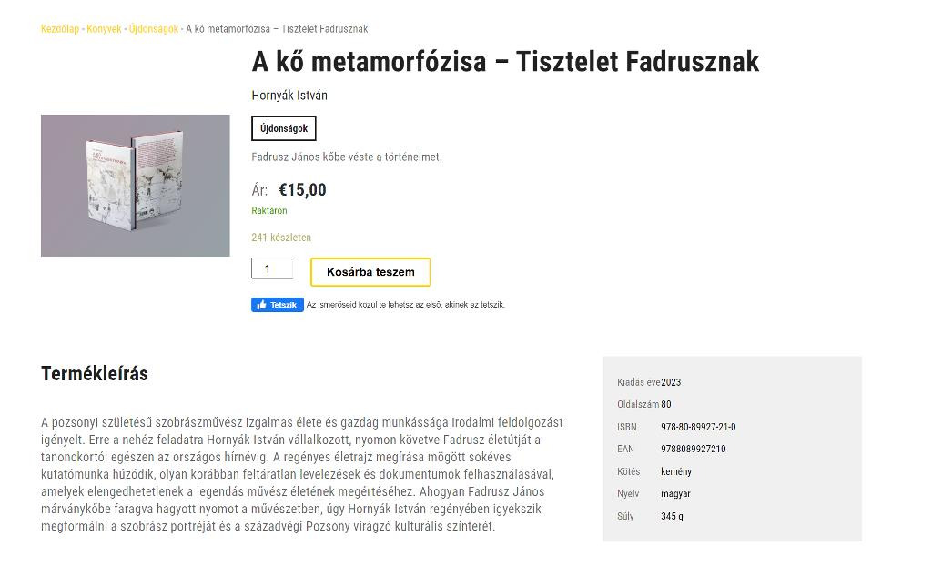 A kő metamorfózisa – Tisztelet Fadrusznak című kisregényt megvásárolható a Pozsonyi Kifli e-shopján.