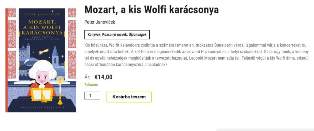 A kötet „Mozart, a kis Wolfi karácsonya“ címet viselő magyar fordítása megvásárolható a pozsonyi adventi vásáron, a Pozsonyi Kifli Pt. Fő téren felállított, B08-as standján, a karácsonyfa közelében, az Óvárosháza kapujával szemben.