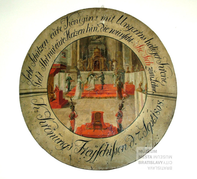 A Pozsonyi Városi Múzeum gyűjteményeiben számos festett céltábla található, de ezeknek csak kis része kapcsolódik a koronázásokhoz. Különösen figyelemre méltó a Habsburg–Estei Mária Ludovika magyar királyné (* Monza, 1787. december 14., – † Verona, 1816. április 7.) koronázását ábrázoló darab. A modenai hercegnő, Mária Terézia unokája, Estei Mária Beatrix és Habsburg–Lotaringiai Ferdinánd Károly Antal főherceg, Lombardia főkormányzója legfiatalabb lánya 1808-ban lett unokatestvére, I. Ferenc császár és király (1768–1835) harmadik felesége. Még ebben az évben magyar királynévá koronázták Pozsonyban. Az 1808. szeptember 7-én tartott ceremóniáról a Pressburger Zeitung két nappal későbbi száma számolt be. A lapból többek között azt is megtudhatjuk, hogy az ünnepség során Pozsonyban koncertezett az Antonio Salieri udvari zeneszerző (1750–1825) vezette császári és királyi udvari zenekar.