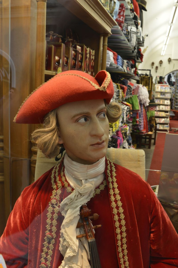 Wolfgang Amadeus Mozart figurája egy bolt kirakatában szülővárosában, Salzburgban (fotó: Robert Hofrichter)