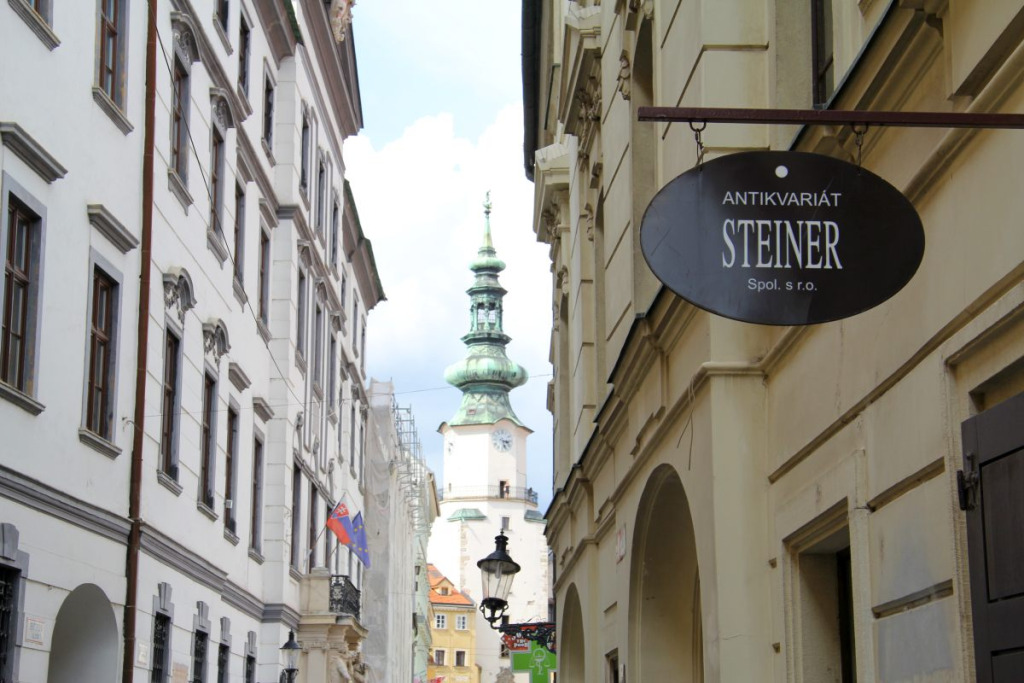 Ein kalter Windstoß weht vom Michaelertorturm, dem einzigen Stadtzugang, der sich von der Stadtbefestigung erhalten hat, herunter. Er lässt jetzt, im Frühherbst, bei mir ein wenig Vorfreude auf den Winter aufkommen, denn dann gehören Michaeler- und Venturgasse den Pressburgern und mir fast allein und dann liebe ich es, hinunterzuspazieren bis zum Steiner, vielleicht dem einzigen Geschäft, das vom blühenden und bunten Einzelhandel des alten Pressburg geblieben ist. Wobei geblieben nicht ganz stimmt, wieder da trifft es besser. Die Steiner und ihre Buchhandlung waren und sind ein Stück Pressburg. Begonnen hat alles mit dem aus Kojetein (Kojetín) in Mähren stammenden Sigmund Steiner und seiner Frau Josephine, die ab 1847 am Schlossgrund ein Antiquariat mit angeschlossener Leihbibliothek betrieben. Für seine Glaubensgemeinschaft spielte der später erblindete Sigmund auch als Talmud-Kenner und -Lehrer eine bedeutende Rolle. Sohn Hermann baute das Geschäft zu einer Buch- und Musikalienhandlung aus, die schon bald (im neuen Haus in der Venturgasse 22) zu einer festen Adresse des intellektuellen Pressburger Lebens wurde, so wie Hermann in den Kreis der Honoratioren seiner Heimatstadt aufstieg und auch über deren Grenzen hinaus, als Gründungsmitglied des ungarischen Buchhändlerverbandes, hohes Ansehen genoss. Die Steiner konnten nicht nur ein weiteres Anwesen in der Pressburger Innenstadt erwerben, sondern auch den von der Familie später so geliebten Garten, der eigentlich ein großes Areal samt Villa war. Heute erhebt sich an dieser Stelle das Ehrenmal der Roten Armee (Slavin). Architektonisch interessanter ist, wenigstens für mich, das Villenviertel rund um Denkmal und Soldatenfriedhof.