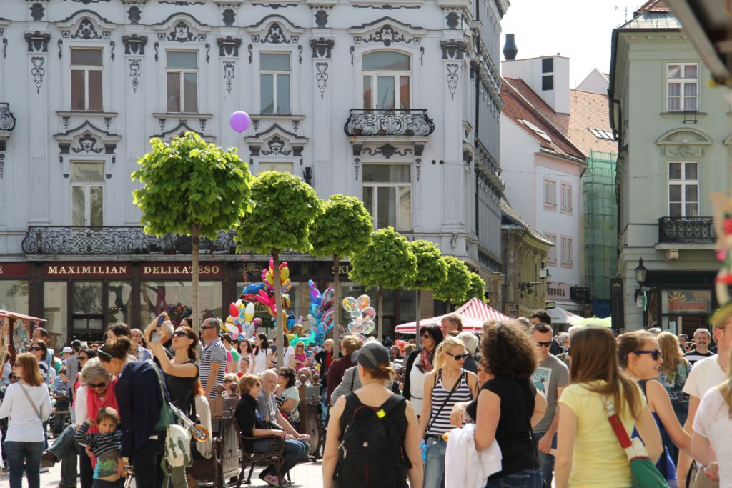 Am Hauptplatz. Karl Benyovszky würde leicht irritiert sein: Sag mir, wo die Bäume sind? Denn vor hundert Jahren war ein großer Bereich des Platzes als Park gestaltet, mit verschlungenen Wegen, säuberlich geschnittenen Bäumen und Sträuchern rund um den Brunnen. Die Geschichte zum sagenumwobenen, von einem Steinmetz aus Deutsch-Altenburg geschaffenen Röhrbrunnen erspar ich Ihnen, Reiseführer widmen sich ihr zur Genüge, außer vielleicht, dass er nicht Rolandbrunnen, sondern Maximilian-Brunnen, nach seinem Auftraggeber Kaiser Maximilian II., heißt. Auch über das Café Mayer im Palais Jeszenak, das so gern als Pressburgs Demel apostrophiert wird, kann ich mir, Ihr Einverständnis vorausgesetzt, viele Worte ersparen. (Erst recht, nachdem die schöne Einrichtung, die wirklich Demel-like war, hinausrenoviert wurde.) Ja, natürlich war der Mayer auch Hoflieferant, immerhin residierten in der Stadt mit Erzherzog Friedrich und seiner Gemahlin Isabella sehr prominente – und reiche – Mitglieder des Erzhauses. (Und geht es nach ihrer Leibesfülle, dürften sie den süßen Mayerschen Genüssen auch nicht abgeneigt gewesen sein).