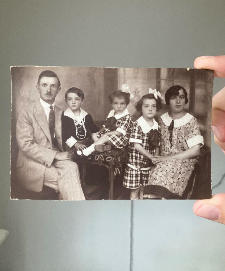 "Na fotke, ktorú držím v rukách, je moja prababka Olga Steindlberger so súrodencami a a rodičmi, na rozdiel od neskorších, ktoré som našiel, nie je datovaná (prababka si na tie fotky zozadu už ako dospelá písala dátumy a popisy toho, čo na nich je - spočiatku striedavo v nemčine a maďarčine, neskôr v slovenčine), ale usudzujúc z jej veku na nej musela vzniknúť niekedy krátko po 1. sv. vojne po rozpade monarchie. Našli sme toho ale s mamou oveľa viac a spojili sme sa s pratetou, ktorá si na rozdiel od mojej babky stále veľa z rodinnej histórie pamätá..."
