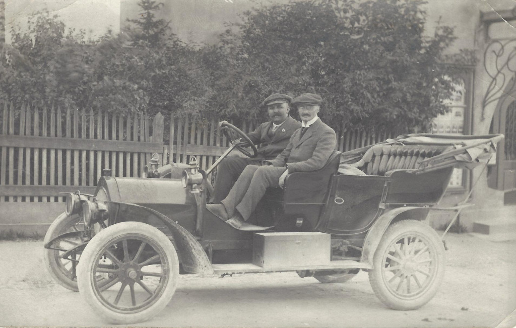 Thomas Alva Edison mit Familie im Automobil mit Chauffeur beim Hotelempfang. Quelle: Archiv der Familie Lippert