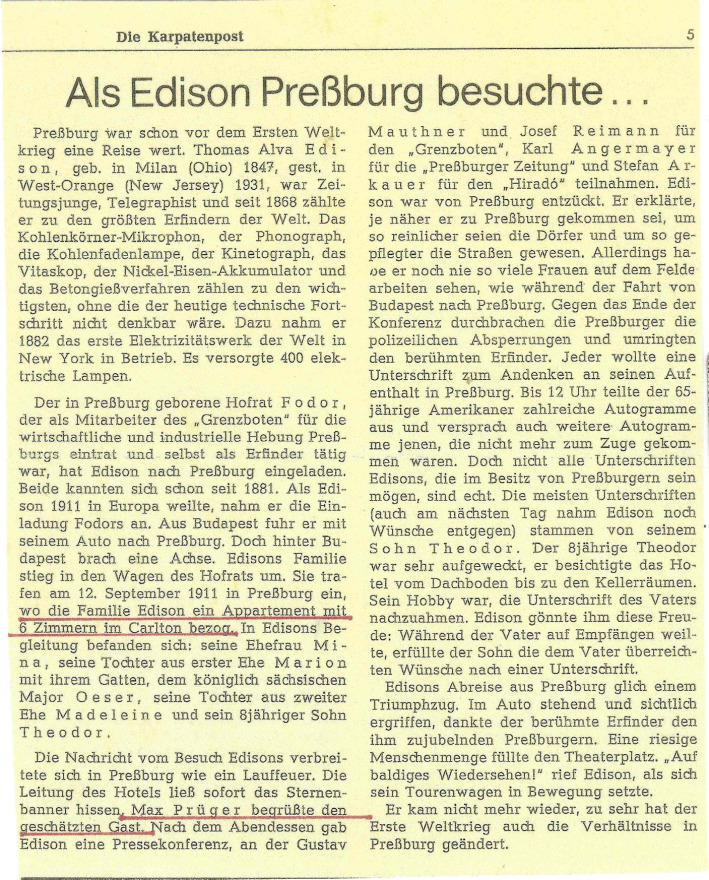 Zu den ganz bedeutenden Ereignissen zählte auch der Besuch vom Präsident Tomáš Garrigue Masaryk am 11.Oktober 1930. Die ganze Stadt sowie auch die Hotels Savoy und Carlton waren festlich geschmückt. Er verbrachte zwei Tage in Pressburg und hatte hier kein reichhaltiges Programm.