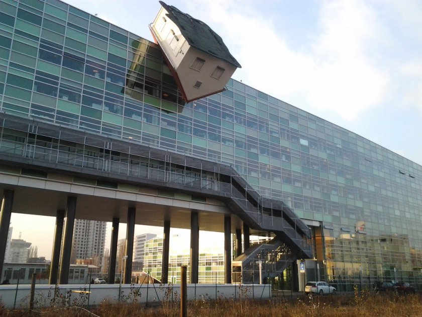 Aztán egy ideje módosítanom kellett a véleményemet. Van ugyanis Ružinov egyik irodaépületének tetején valami, amiről bátran kijelenthetjük, hogy nem szokványos alkotás. És bár az elszántabb pozsonyjárók már nyilván ismerik, én azért nem röstellek itt és most írni róla, hiszen nincs is annyira szem előtt: egy feje tetejére állított házról van szó. A Bajkáli út nyugati oldalán, a Kikötői híd felé tartó útsávok mellett, egy irodaház tetején találkozhatunk vele.