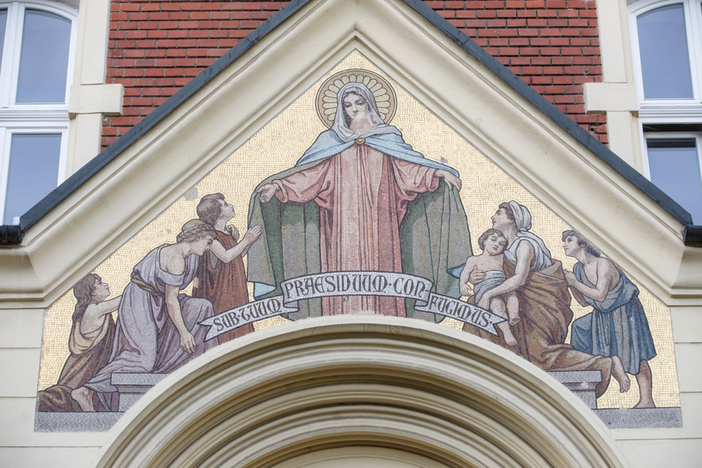 A Köpenyes Mária v. Madonna della Misericordia egy ikonográfiai megnevezése a Szűzanyának, aki kitárt karjával köpenye oltalma alá vonja a hozzá folyamodókat. Itáliában már a XIII. században, majd az egész nyugati keresztény művészetben népszerű volt a téma. Máriának ez az ábrázolása később is folytatódott, főként a barokk korban, de mint Lotz példája is mutatja, a képzőművészek később is visszatértek hozzá. A pozsonyi mozaikképen ábrázolt Mária a romanizáló bélletes főbejárat timpanonjában, aranyozott háttér előtt tárja szét oltalmazóan a karjait és köpenyegét, fejét korong alakú dicsfény övezi, piros ruhát visel, melyet kék palást takar, mint az a 16. század óta pápai utasítás alapján minden Mária-ábrázolásra jellemző. Két oldalán három-három térdeplő-görnyedő, könyörületért esdeklő, szép arcú gyermek, illetve fiatal felnőtt alakja tölti a teret. A kép alján keresztbe futó szalagon egy latin felirat olvasható: SUB TUUM PRAESIDUUM CONFULIMUS – Oltalmad alá futunk, az egyik legrégebbi ismert Mária-ének, ill. imádság kezdő szavai.