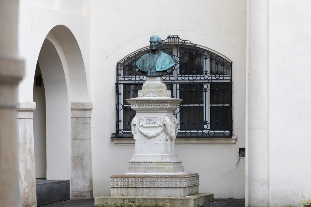 A következő műalkotás, amelyik számomra különösen kedves és nem kevésbé érdekes, az Rómer Flóris mellszobra. A jelenleg az óvárosháza udvarának sarkában álló műalkotás Stróbl Alajos szobrászművész munkája. A tudós tanár, régész, művészettörténész, festő és nagyváradi apátkanonok Rómer Flóris Pozsonyban született 1815. április 12-én. Német ajkú szülei papi pályára szánták, és tanulmányait úgy irányították, hogy a pozsonyi gimnáziumi évei alatt cserediákként a magyar és szlovák nyelvet is elsajátítsa Trencsénben, illetve Tatán. Ezirányú tanulmányai után a bakonybéli bencés kolostorba, majd Pannonhalmára és Tihanyba került, és 1838-ban pappá szentelték. Egy évvel később már a győri bencés gimnázium filológia, majd természetrajz tanára, mígnem 1845-ben kinevezték a pozsonyi királyi akadémia nyilvános rendes tanárává, ahol fizikát és természetrajzot tanított egészen a szabadságharc évéig. Közben József nádor fiának, József Károly főhercegnek a nevelője is volt, majd 1848-ban a forradalomtól lelkesedve „elhagyta a kolostort és a fényes udvari szolgálatot”, beállt katonának. Előbb utász közlegényként, végül honvédtisztként a századosi rangig jutva szolgálta hazáját. A császáriak ezért hét év várfogsággal jutalmazták.