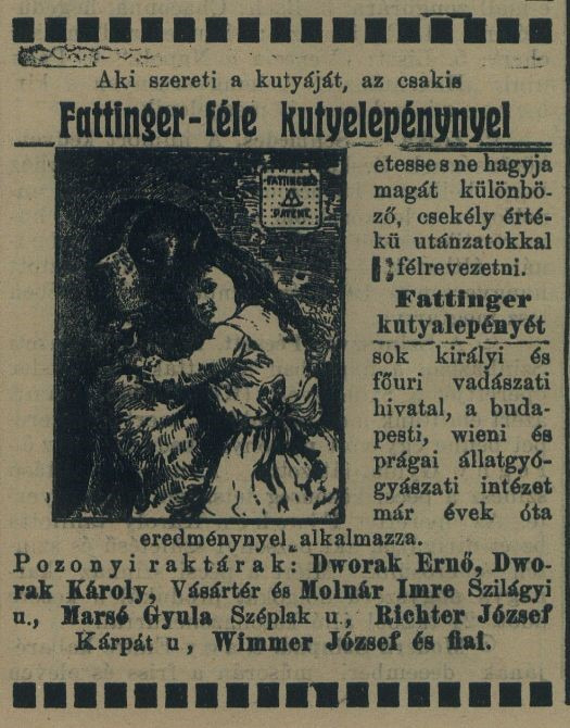Az Állatvédelem című folyóirat 1909-ben indított egy cikksorozatot a helyes ebtartás és -gondozás témájában. Ebben szó van a megfelelő táplálékról is, a szerző megemlíti például a Fattinger-féle „ebpogácsát“ – ezt a NYMH-ban is rendszeresen reklámoztak –, de amelyet túl magas ára miatt „közönséges ebek“ számára nem ajánl. (Az összetételét elnézve – húsrost, liszt, murokrépa – nehéz elképzelni, mi kerülhetett rajta olyan sokba.)