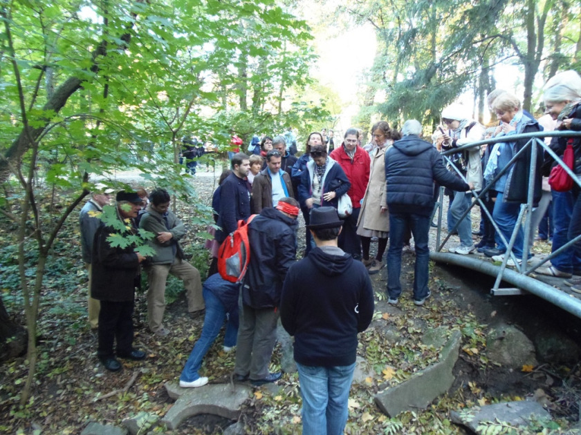 Aztán 14 órától egy echte Kiflis felfedezőtúra következett, ezúttal nem a szűkebb értelemben vett központ volt a cél, hanem a Védcölöp út fölött húzódó lombos városrész felől indultunk egyenesen a Hegyi park irányába. Jó érzés volt látni a vezetőnk mögött kanyargó-kígyózó emberek (már-már tömegnek is nevezhető) csoportját – nyilván a szép idő, az izgalmasan megfogalmazott téma, no és a Minorma keretfesztivál nyújtotta többlethírverés is megtette a magáét. Maga a séta remekre sikeredett, olyannyira remekül, hogy a rekordszámú résztvevő közt (több mint hetven ember vállalta a háromórás kalandtúrát) a M_P_ BA polgári társulás is képviseltette magát: őnekik pedig érdekes túrákért igazán nem kell a szomszédba menniük. Egyszóval jó érzés volt pontról pontra oknyomozni, közben tudatosítva, hogy míg a legtöbb hagyományos városvezetőnek mindenféle palotahomlokzatok, templomtornyok, királyok meg királynék kellenek, addig íme, a Pozsonyi Kifli néhány kertvárosi villák közé elszórt, málladozó kőcsökevény kapcsán is képes izgalmakkal teli honismereti túrát szervezni. Úttalan utakon, árkon-bokron, néhol egymást is segítve, az egészséges fanatizmus kategóriáját kimerítve kutattuk a sokszor egészen bozótlepte határköveket, amelyek kapcsán vérprofi vezetőnk, RNDr. Milan Thurzo egy valóságos emlék-topográfiát rajzolt fel.