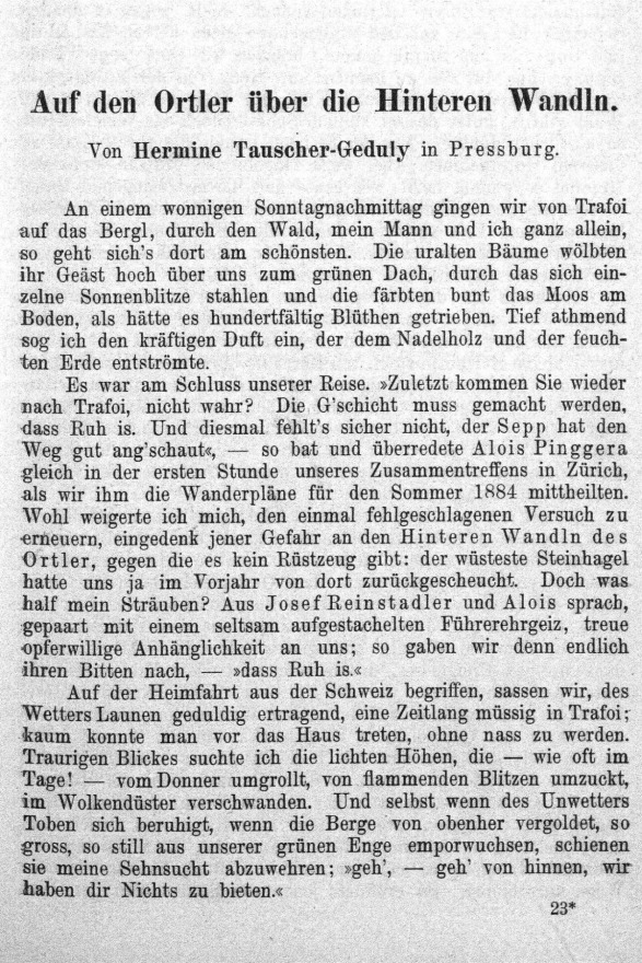 Hermina cikke az Ortler megmászásáról, amely 1885-ben jelent meg a „Zeitschrift des deutschen und österreichischen Alpenvereins” folyóiratban (forrás: www.anno.onb.ac.at)