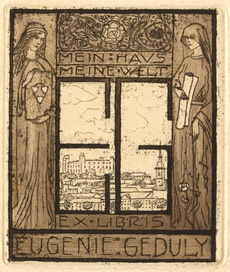 Ex libris Geduly Eugénia számára Pozsony látképével, Emil Orlík cseh festőművész és grafikus alkotása (forrás: www.collections.imm.hu)
