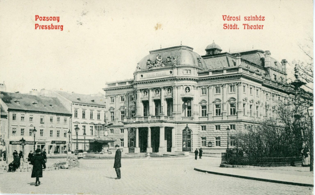 A pozsonyi Városi Színház megnyitója, 1886. szeptember 22. Az új színház építésekor Pozsony országos jelentősége már a múlté. Az utolsó pozsonyi koronázás 1830. szeptember 28-án V. Ferdinánd koronázása volt, az utolsó pozsonyi országgyűlést 1848. április 11-én nyitották meg. Befejezése után az országgyűlés és a minisztériumok Pestre költöztek. Buda és Pest egyesítése 1873. november 17-én végérvényesen lezárta a Mohácsi vésszel kezdődő jelentős pozsonyi korszakot. Ennek ellenére az új pozsonyi színház megnyitó ünnepélye olyan nagyszabású volt, mintha Pozsony még mindig koronázási főváros lenne. A korabeli sajtó, (a Budapesti is), nagyon dicsérte az épületet, és annak elhelyezését. Külön kiemelték, hogy a 300 000 frt. (ma kb. 4 millió €) költséggel a város önerőből építette fel a színházat. A megnyitó ünnepély fontosságát hivatalos résztvevőinek névsora is bizonyítja: Tisza Kálmán miniszterelnök, Trefort Ágoston vallás és közoktatásügyi miniszter, Frigyes főherceg és Isabella főhercegnő, Erkel Ferenc, Jókai Mór, a Nemzeti Színház és az Opera Színház intendánsa gróf Keglevich István, a Pozsony vármegyei kerületek országgyűlési képviselői, és még sokan mások.
