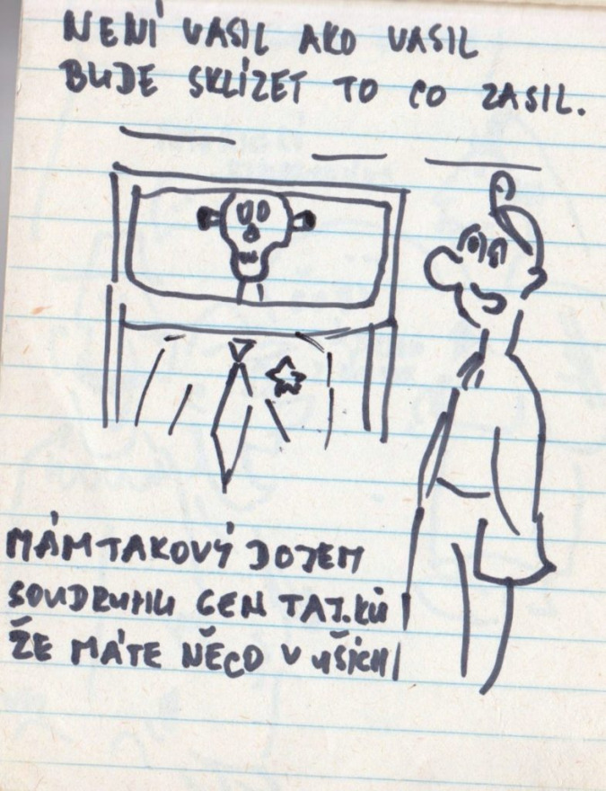 Több rajzon is feltűnik Vasil Biľak vagy Miloš Jakeš vezető kommunista pártfunkcionáriusok neve vagy alakja, a legtöbb viszont névtelen figurákkal vagy vicces-rímes sorokkal mutat görbe tükröt a roskadozó rendszernek (több esetben cseh nyelven).