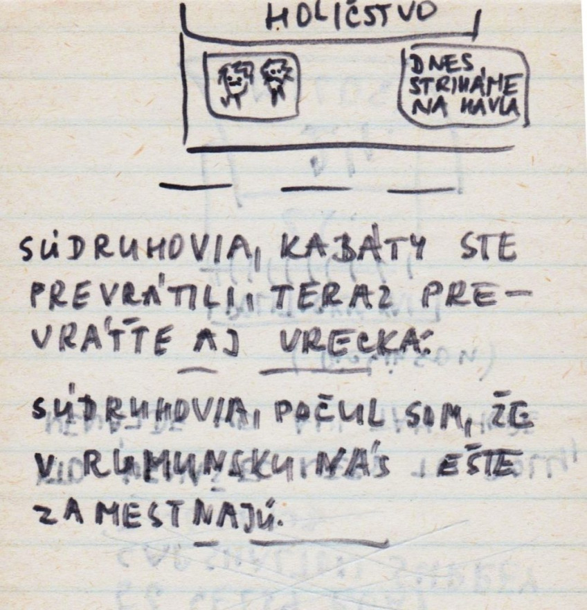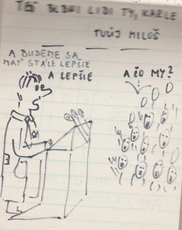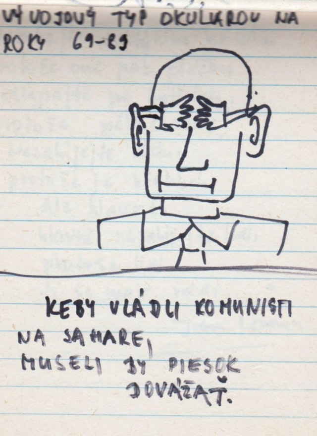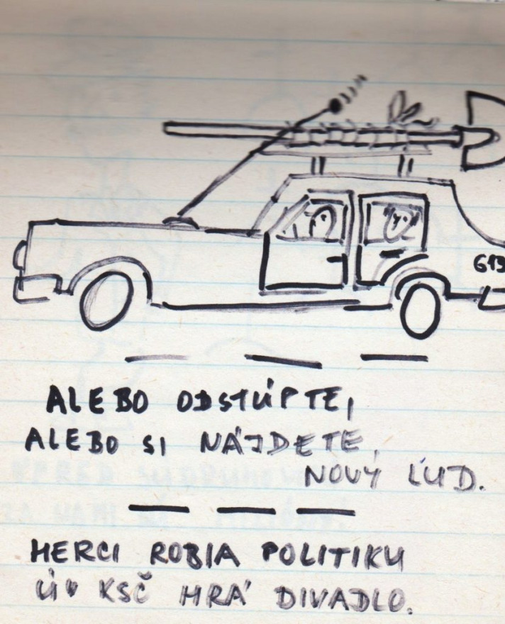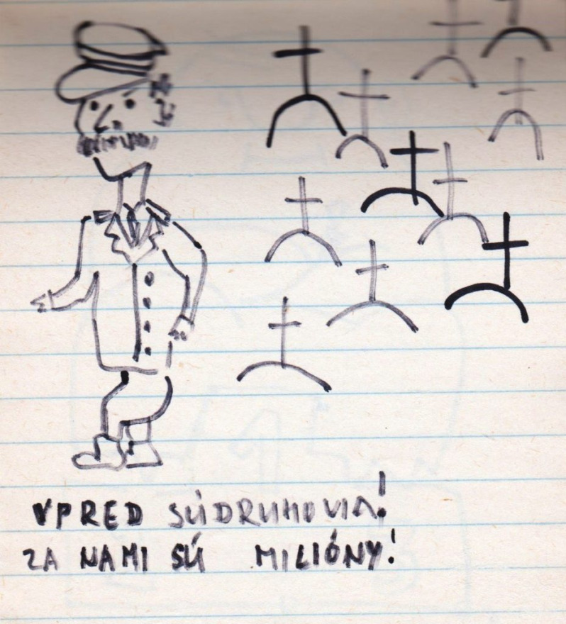 „A műszaki egyetem vegyészmérnöki karára jártam, elsős voltam. Akkoriban már elég nagy szabadság volt ahhoz, hogy mehessünk kulcsokat csörgetni a Szlovák nemzeti felkelés terére (Námestie SNP). Nem féltem – ott senki sem félt. Próbáltam emléknek megörökíteni, hogy mi került az utcára. Ahogy az Széplak utcáról megyünk a Prior felé, ott volt sok ilyen, plakátokon kiragasztva. Sok helyen felbukkantak ezek a karikatúraszerű rajzok, meg a szomszédos utcákban is – jellemzően a belvárosban. Azokat rajzoltam le, amik igazán tetszettek. A készítés ideje 1989 novembere” – mondta a jegyzetfüzet története kapcsán Mária.