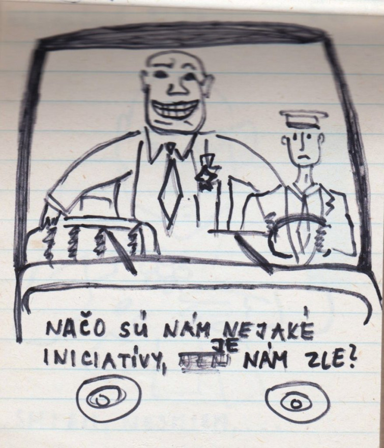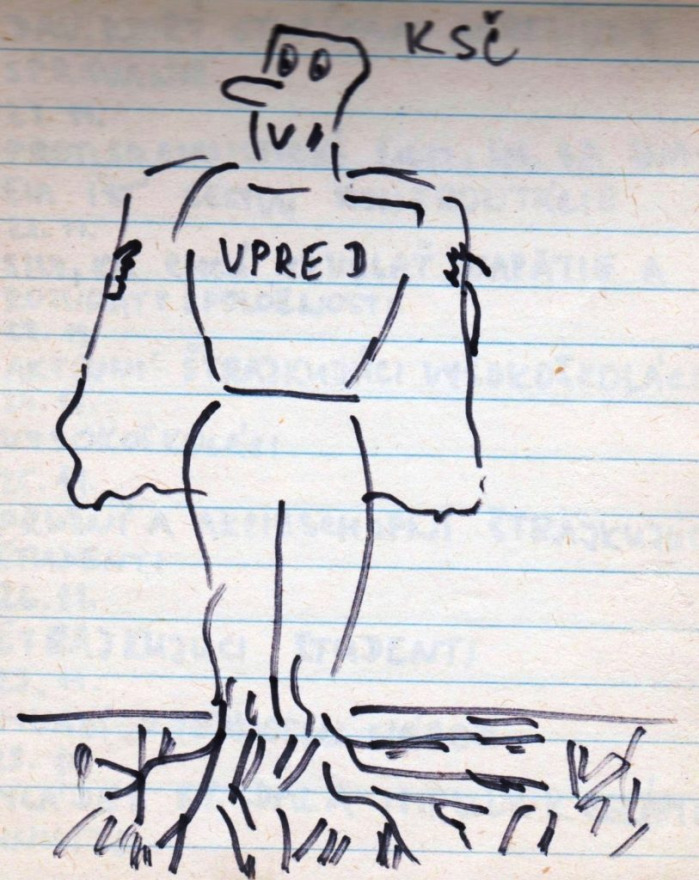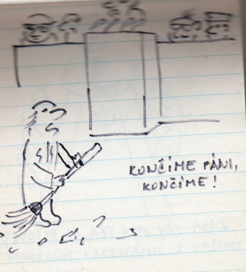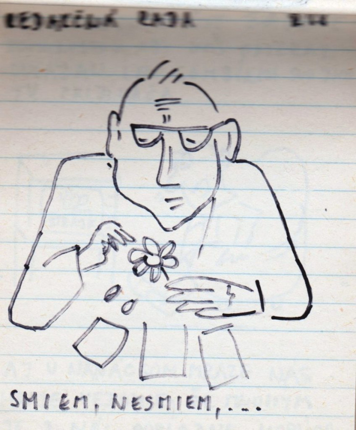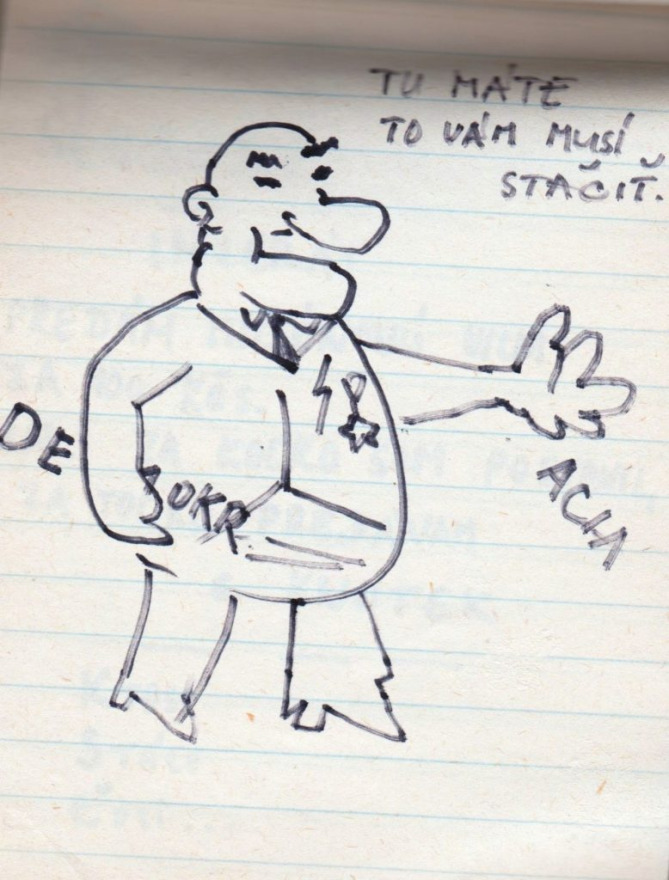 „A műszaki egyetem vegyészmérnöki karára jártam, elsős voltam. Akkoriban már elég nagy szabadság volt ahhoz, hogy mehessünk kulcsokat csörgetni a Szlovák nemzeti felkelés terére (Námestie SNP). Nem féltem – ott senki sem félt. Próbáltam emléknek megörökíteni, hogy mi került az utcára. Ahogy az Széplak utcáról megyünk a Prior felé, ott volt sok ilyen, plakátokon kiragasztva. Sok helyen felbukkantak ezek a karikatúraszerű rajzok, meg a szomszédos utcákban is – jellemzően a belvárosban. Azokat rajzoltam le, amik igazán tetszettek. A készítés ideje 1989 novembere” – mondta a jegyzetfüzet története kapcsán Mária.
