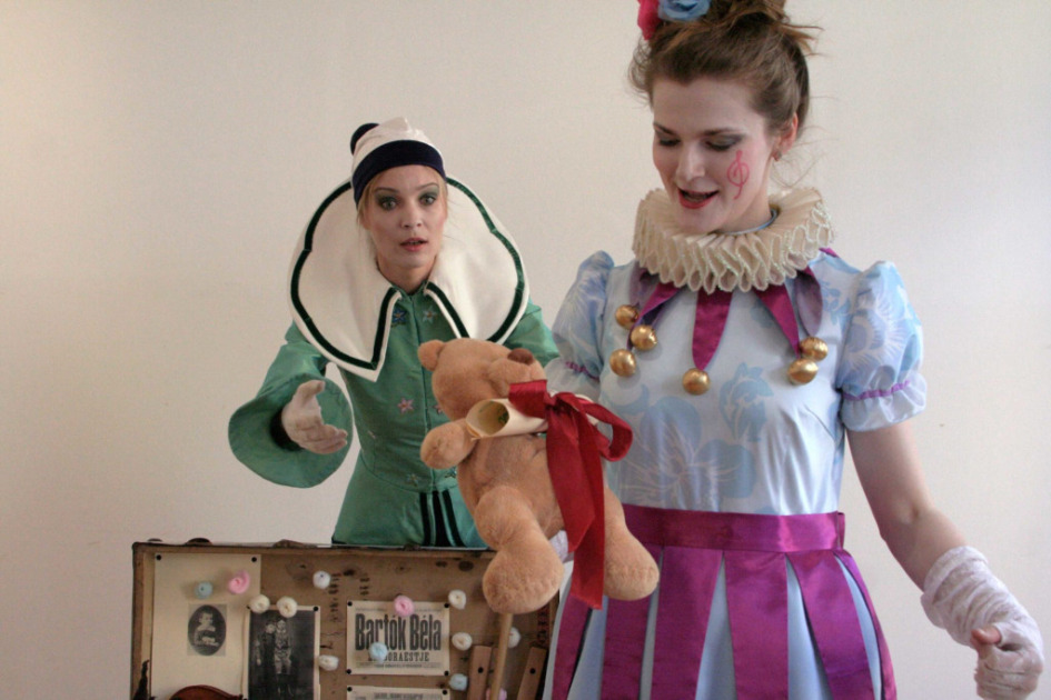 A Bartók és a fából faragott királyfi egy vidám clowniáda remek színészi alakításokkal, táncos és zenei betétekkel. Az előadás a drámapedagógiai módszereket is figyelembe véve érzékenyen utal Bartók Béla zenei örökségére. Bartók gyerekkorának és korai zenei fejlődésének időszaka az olasz commedia dell’arte klasszikus szereplői, Harlekin (Garajszki Margit) és Colombina (Júlia Urdová) által kel életre. A jelmezeket Eva Šimáková tervezte és valósította meg.