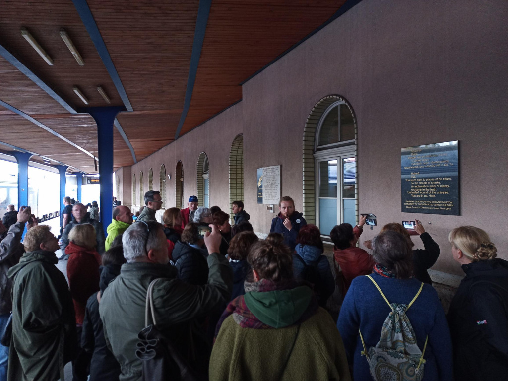 A több mint hatvan érdeklődő az egykor a neológ zsinagógának, ma pedig a holokauszt-emlékműnek helyet adó térről indult, és – a számos részterületet felölelő ismertető részeként – a többi közt hallhatott a könyvkereskedő Steiner család sorsáról, a szlovák állam zsidóellenes jogszabályairól vagy éppen Jozef Tiso államelnök zsidókhoz fűződő viszonyáról. A tematikus városnézés utolsó állomása a zsidók haláltáborokba deportálásáról szóló, a vasúti főpályaudvar épületén elhelyezett emléktábla volt.
